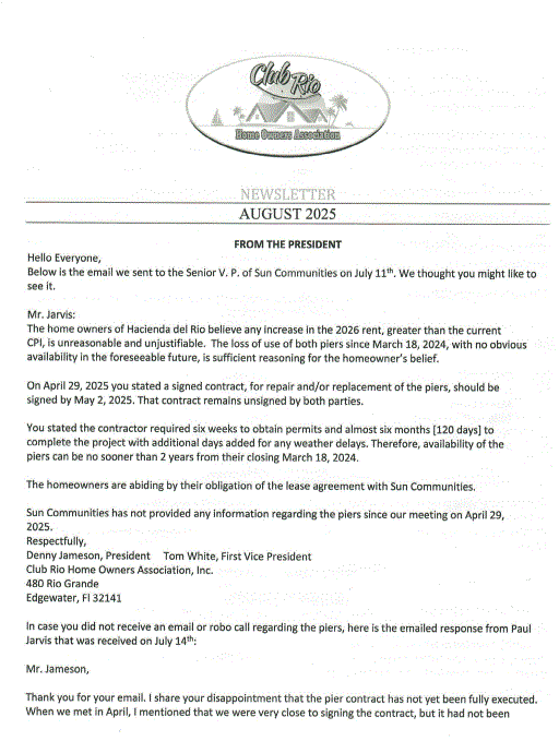 GENERAL CONSENSUS OF THE RESIDENTS OF HDR 1. EXPEDITE HDR PIER REPAIRS IMMEDIATELY, FASTER! 2. RETRACT HDR 2026 RENT INCREASE NOW! 3. FORGET THE AD VALOREM TAX SCHEME AT HDR! 4. NO RENT INCREASE FOR 2027 AND 2028 REPARATIONS! 5. MAINTAIN THE PROPERTY AS PROMISED AND PAID FOR! |