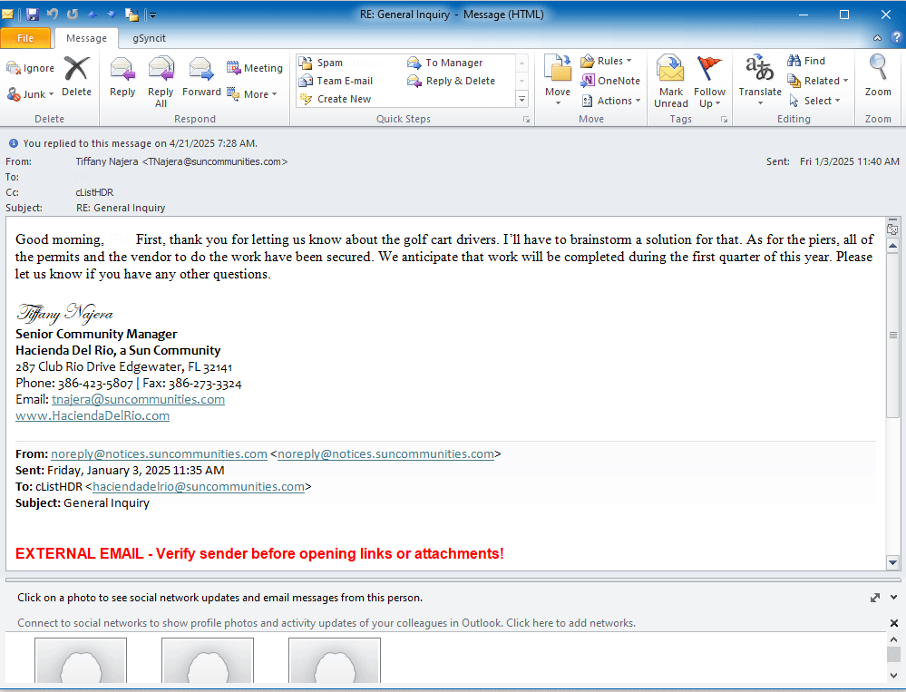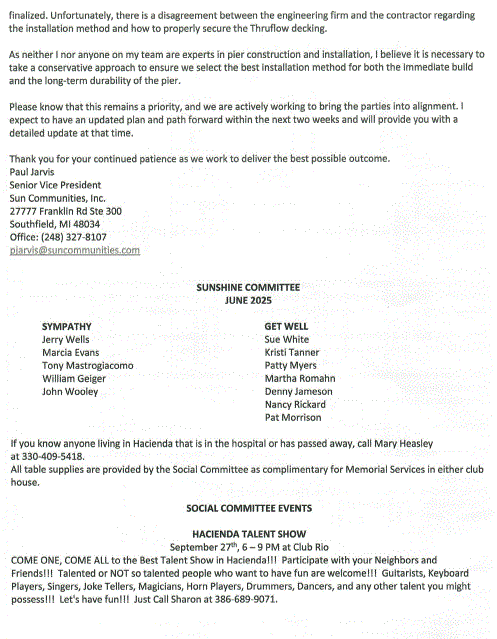 | Actual Statements below from Sun Communities Residents and Local Contractors, WebScraped from over 25 Review Sites, Nextdoor, as well as Public & Private Facebook Groups "I took a cart ride to Rio where I encountered an individual sporting a BCI shirt near the rear of the clubhouse. Inquiring about the size of his company, he shared that they consistently employ over 45 men. I probed further by asking if having more personnel working simultaneously on both piers would expedite project completion. He responded humorously (of course it would). I then posed another question: Why isn't your entire team here expediting the work to its conclusion, wouldn't it make sense to finish quickly, receive payment, and move onto the next job? Regrettably, he remained silent and only smiled in the direction of the office." Hacienda Del Rio Resident - December 8, 2025 "Our park is nearly pristine, except for the unsightly proliferation of cigarette butts everywhere. While issues are generally addressed (sometimes taking months and/or years for repairs) our residences surpass the average in quality. It is Sun Communities' tarnished reputation and exorbitant lot rent fees that are undeniably sabotaging home sales here at Hacienda Del Rio. This situation has rapidly morphed into a financial quagmire, leaving us all trapped in an untenable predicament... We are praying for a miracle, but in all reality we're essentially screwed :(" Hacienda Del Rio Resident - December 2025 "We are utterly shocked by the magnitude of the damage that Sun Communities' appears to have inflicted upon Hacienda's reputation. Their negligent actions & lack of concern for the community's well being seem to have significantly devalued our property, making it hard to find new residents. The value of our home, which was intended to provide us with a comfortable retirement and financial security, has been destroyed. We had almost given up hope when a potential buyer emerged at the last minute, but the sale fell through once the buyer performed a (GOOGLE) search. This turn of events has left us feeling helpless and frustrated, as we were relying on this investment for our future plans. Oh my god, how did this happen?" HDR Resident - November 2025 |