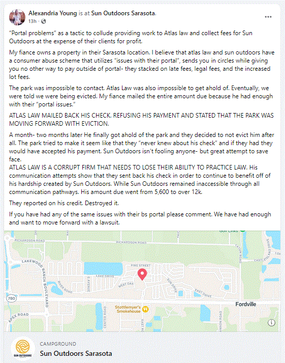 A Concerned Consumer's recent report about Sun Communities and Atlas Law, from Facebook! |