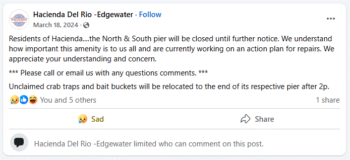 640+ days since Mar 18, 2024 closure of the Piers at Hacienda Del Rio by Sun Communities!