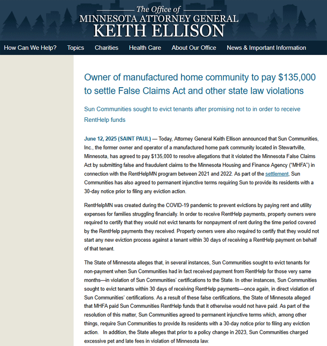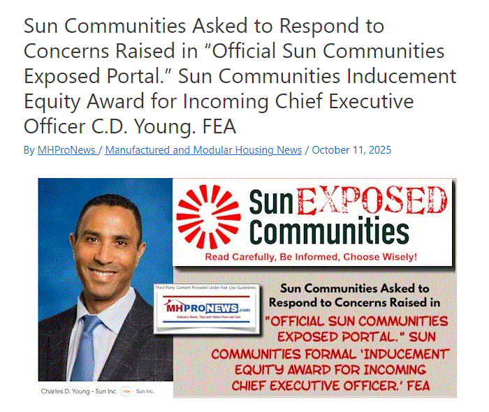 | "It is not surprising that Sun Communities has chosen to remain silent in light of the numerous claims and allegations against them, as well as the ongoing shortcomings in their fulfillment of obligations and tenant care. These issues encompass a wide range of concerns, such as poor maintenance, unresponsive management, and questionable business practices, which have been raised by residents and industry experts alike. By refraining from responding, Sun Communities may be attempting to avoid admitting any wrongdoing or addressing the persistent challenges they face in meeting their responsibilities towards their tenants." Hacienda Del Rio Resident, October 2025 |