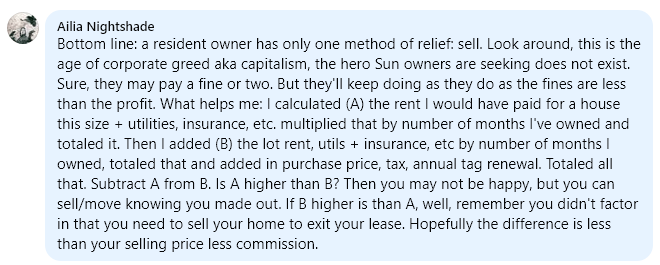 A Concerned Consumer's Solution to Escape the Sun Communities Financial Trap, from Facebook! ![]() |