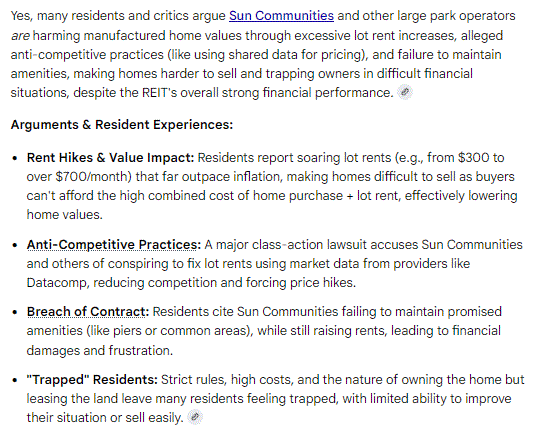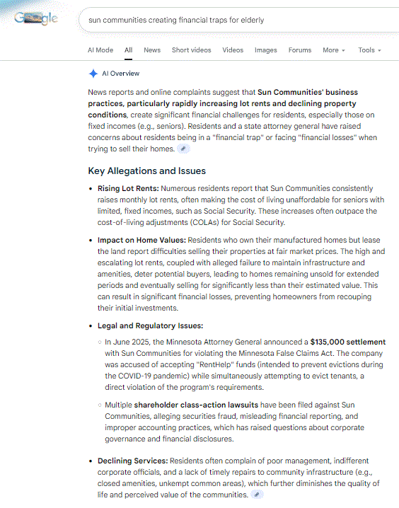 Social Media Review and Search Engine Damage: A critical, and increasingly potent, vulnerability for Sun Communities which directly damages its shareholders is the amplification of negative feedback through the digital landscape. Sun Communities and their failures as well as bad reviews actively harm them, and search engines with the use of Artificially Intelligent WEBots are exacerbating the problem. Search engines like Google are increasingly leveraging AI to aggregate and analyze reviews from multiple sources – Google Maps, Yelp, Facebook, Trustpilot, and specialized review sites. This creates a much more comprehensive and dynamic picture of a company’s reputation. These systems are destroying the reputation of the corporation, and the negative information is readily accessible to every potential tenant and/or resident on the planet. If Sun Communities refuses to alter its course, disaster looms on the horizon: Its very existence hangs in the balance, threatened by the repercussions of its unchanged ways and how it is perceived by others. A turning point lies ahead, where the company must choose between persisting down a dangerous path or taking decisive action to secure its future. |